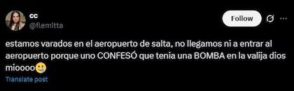 En redes sociales, varios usuarios compartieron imágenes del momento y expresaron su malestar por las demoras. “Estamos varados en el aeropuerto de Salta, no llegamos ni a entrar porque uno confesó que tenía una bomba en la valija. Dios mío”, escribió una usuaria en X.